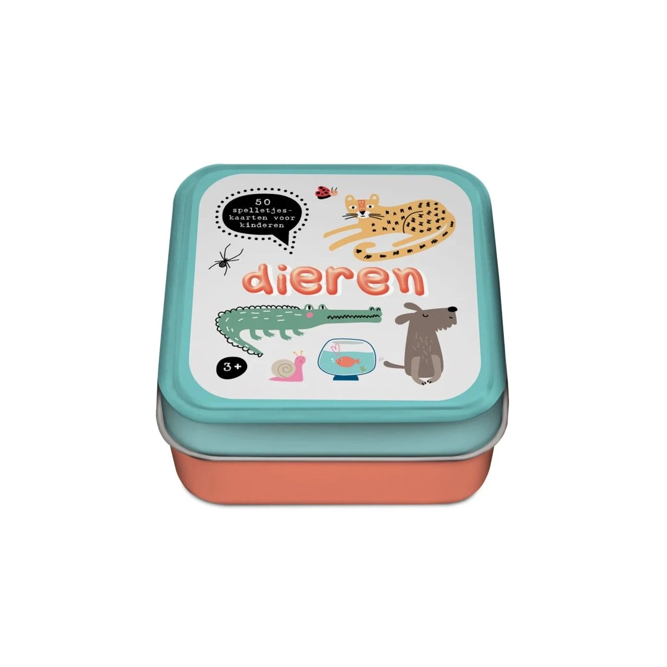 Blik met 50 spelletjeskaarten voor kinderen met als thema Dieren.