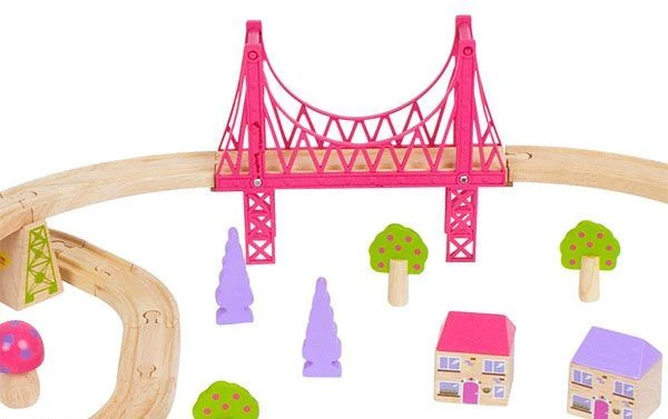 Treinset Sprookjesstad BigJigs BJT023. Fraaie 75 delige BigJigs houten treinset met als thema ”sprookjes”! De set is o.a. voorzien van rails, bomen, trein, helicopter, brug, huizen en sprookjesremise. Afmetingen: 114 x 70cm. Geschikt voor kinderen vanaf 3 jaar.