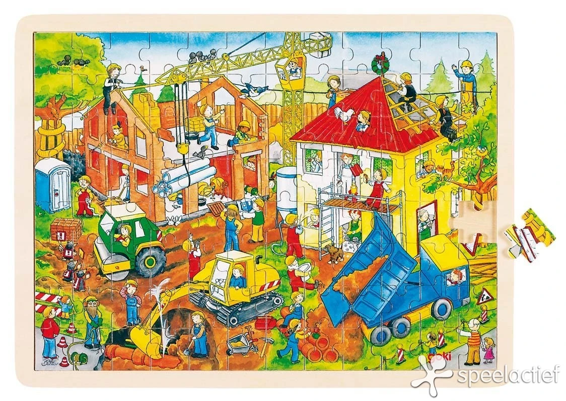 Houten legpuzzel met thema de bouwplaats. De afbeelding bestaat uit 96 stukjes. Afmetingen puzel: 40 x 30 cm.