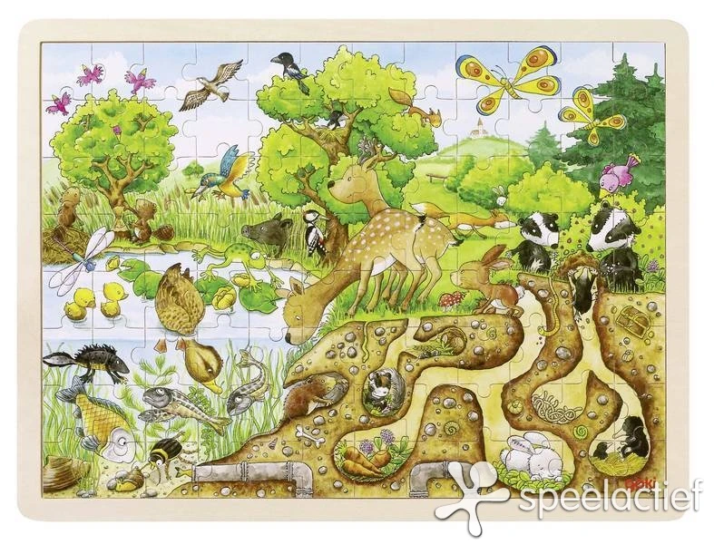 Houten legpuzzel met thema “De Natuur”. De afbeelding bestaat uit 96 stukjes. Afmetingen puzel: 40 x 30 cm.