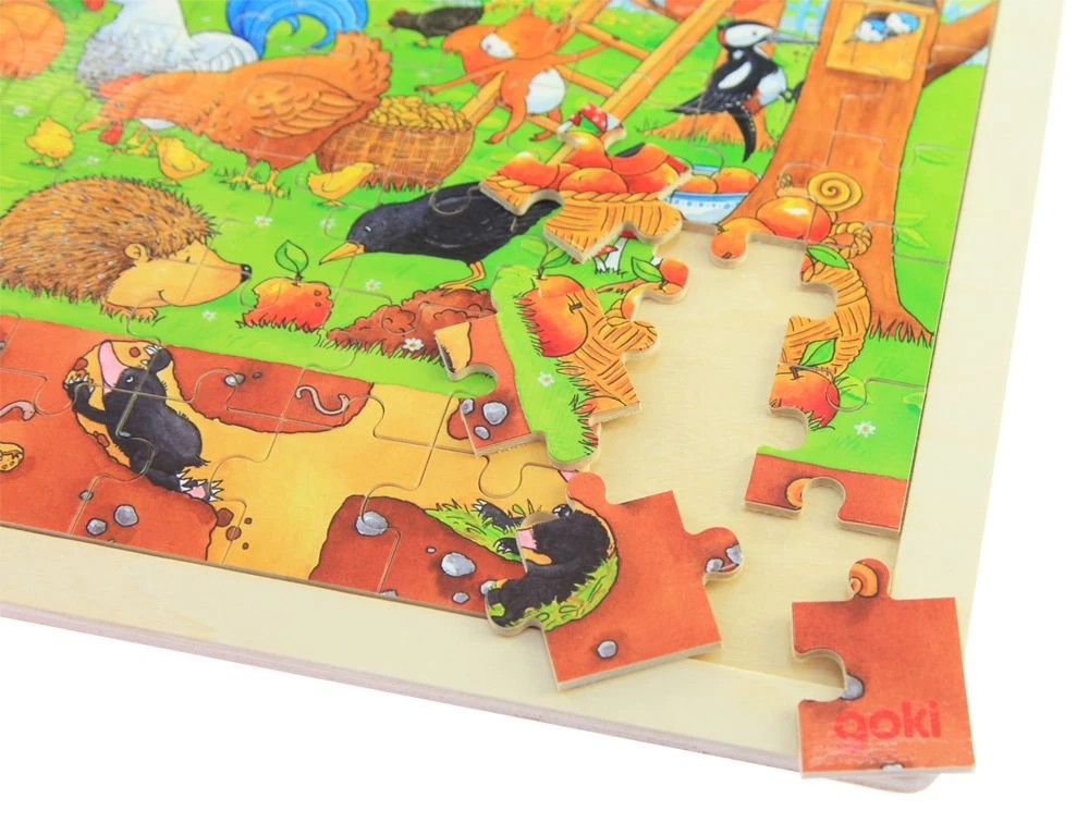 Houten legpuzzel met als thema het tuinleven boven en odner de grond. Puzzel met 96 stukjes.