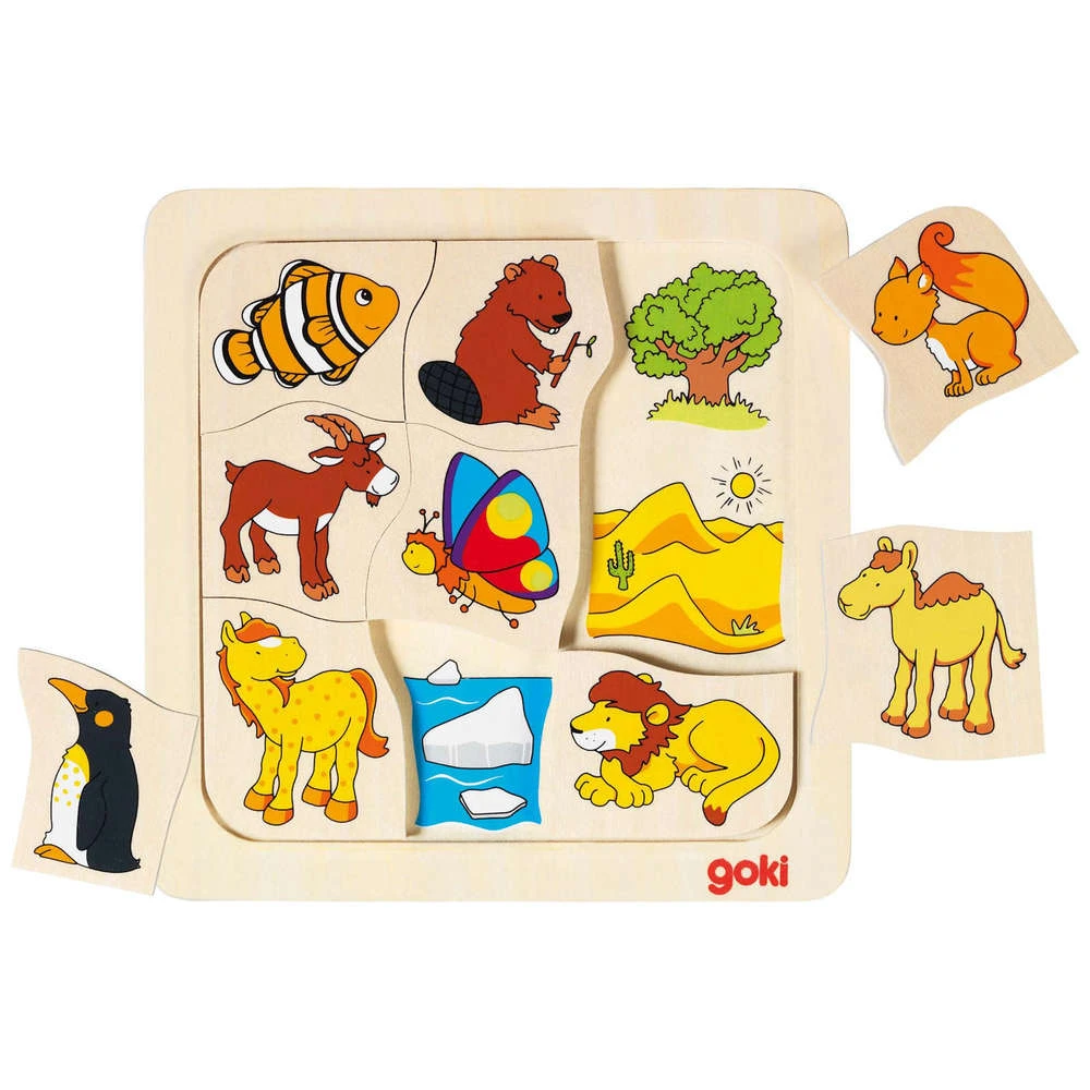 Wie woont waar? Leg de juiste dieren op de plek waar ze wonen en leven en de puzzel is compleet. De puzzel bestaat uit 9 puzzelstukjes.