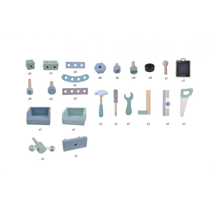 Speciaal voor elke kleine klusser die geen enkele klus uit de weg gaat: de stoere houten werkbank van Little Dutch. Er is genoeg gereedschap waarmee getimmerd, gezaagd of gebouwd kan worden. De hele set bestaat uit 48 onderdelen, waaronder een hamer, schroevendraaier, blokjes, plankjes, boutjes en moertjes en een handige, verstelbare gereedschapsgordel, waarmee je al het gereedschap gemakkelijk bij de hand houdt.