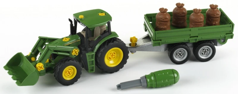John Deere constructietrekker met voorlader en aanhangwagen. Met de bijgeleverde schroevendraaier zijn zowel de tractor als de aanhangwagen te (de)monteren. Compleet met 4 “gevulde zakken” welke als lading fungeren.