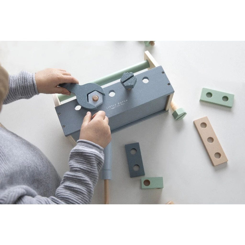 Deze gereedschapskist bestaat uit 20 onderdelen in mint en blauwe tinten. Voor de kleine klussers en voor de ontwikkeling van de fijne motoriek. Origineel om cadeau te geven!