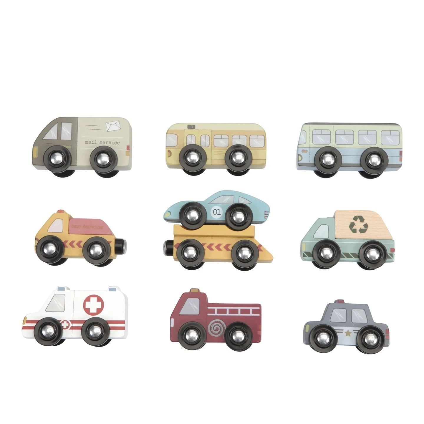 Deze houten bedrijfs en – hulpverleningsvoertuigen zijn ontworpen om samen te gebruiken met de houten treinset van Little Dutch. De voertuigen zijn geschikt om op de rails te rijden en zo hulp te bieden waar ze nodig zijn in de stad. Gebruik de voertuigen met de treinset XXL en de uitbreidingssets voor uren speelplezier.