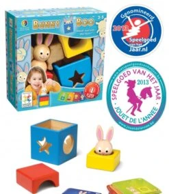 Met Bunny Boo kunnen jonge kinderen de fascinerende wereld van 2D en 3Druimte verkennen. Los de 60 opdrachten op en leer begrippen zoals boven/onder, binnen/buiten, zichtbaar/verborgen, enz. Kijkt het konijn door het ronde gat of door de ster? Zit het konijn op de gele, de rode of de blauwe blok? Sommige opdrachten zien er bijna hetzelfde uit. Toch kan de oplossing verrassend anders zijn, naargelang hoe ver de oren van het konijn boven de blokken uitsteken.
