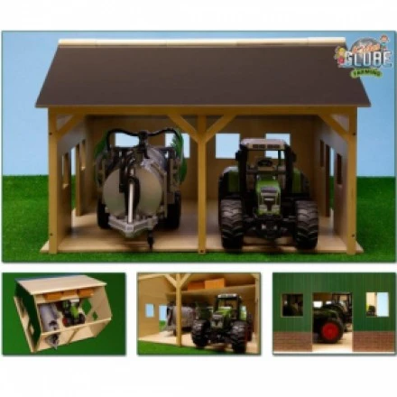 In deze tractorloods passen 2 voertuigen met een schaal van 1:16, zoals bijvoorbeeld de Bruder tractoren.