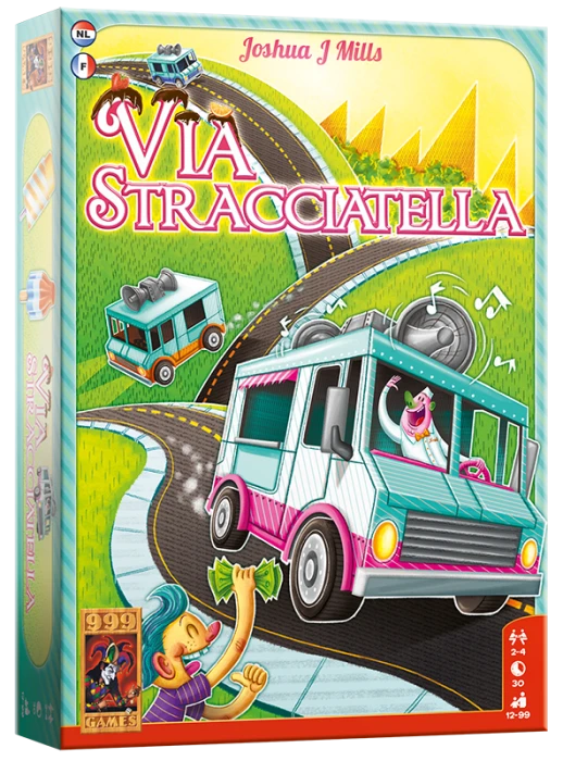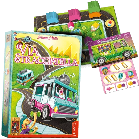 In Via Stracciatella beheer je een ijscokar. Zoek de beste locaties om klanten te lokken en lever de door hun gewenste ijsco’s. Op die manier scoor je loyaliteitspunten. Wie er aan het einde de meeste heeft, wint het spel.