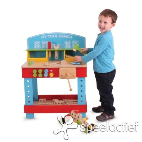 Wat zal de klusjesman of -vrouw blij zijn met deze prachtige complete werkbank ! Alle onderdelen en gereedschappen zijn gemaakt van duurzaam hout en veilig in gebruik.